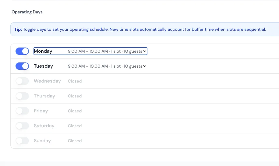 Toggle the days you run, set departure times, and Zuru enforces buffer time between sequential slots automatically. Copy a week's schedule in one click, close a day in seconds, and keep availability synced everywhere.